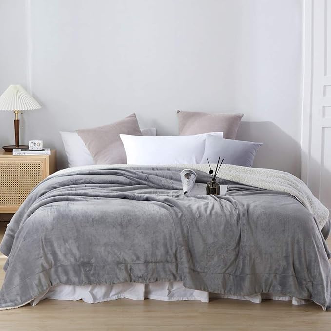 NANPIPER Flannel Blanket Reversible Sherpa Throw Blanket Super Soft Plush Warm Fleece Microfiber (90"x90",Light Gray) Queen