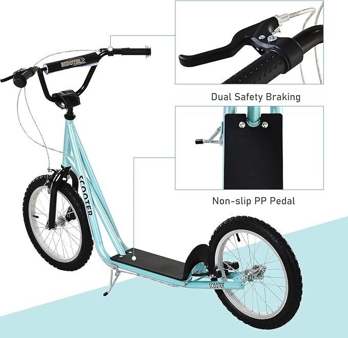 Aosom Youth Scooter Kick Scooter for Kids 5+, Max Load 220 LBS., with Adjustable Handlebar, 16" Inflatable Wheels, Dual Brakes