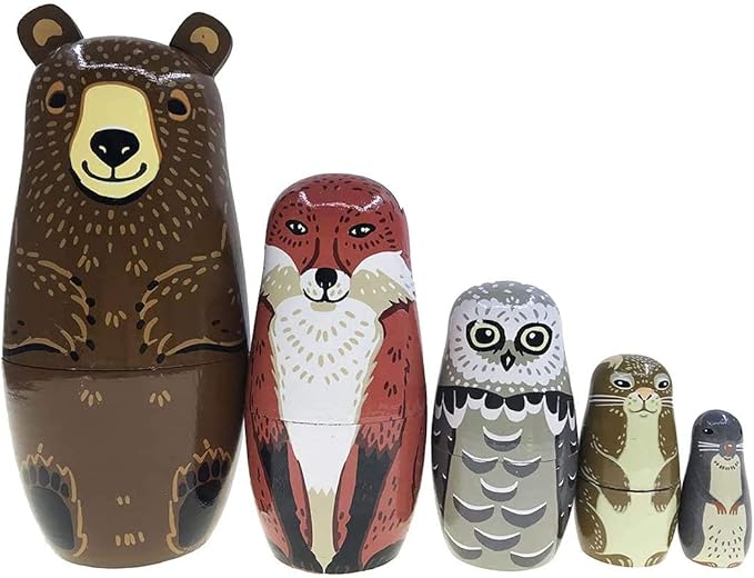 Nesting Dolls-Brown Cartoon Owl Bear Fox Raccoon Russian Nesting Dolls Wooden Matryoshka Doll Handmade Stacking Toy Set 5 Pieces for Kids