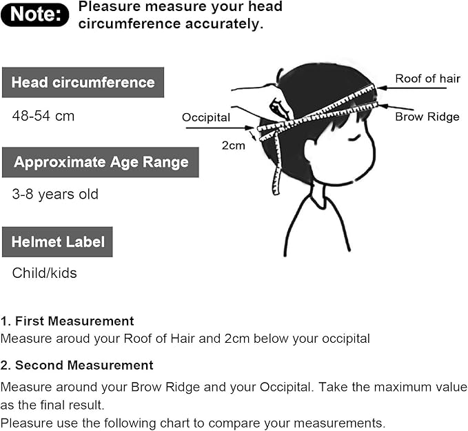 - Kids helmet: Suitable for 3-8 years old kids and toddlers with helmet size: 48-54 cm / 18.9-21.3". This kids bike helmet is easily adjustable for a snug fit, it could grow with your child for few years.