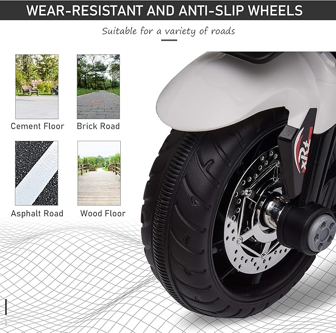 - High-Traction Wheels: The wheels have rugged traction to keep the ride-on motorcycle safe even when splashing through puddles. The tires are extra wide and textured for safety and stability, and the triple-wheel design offers sure footing. Offer a powerful drive to let your kid run over wet ground and have fun even if it's rained, without your concerns of unsafe riding. With more power comes more fun.