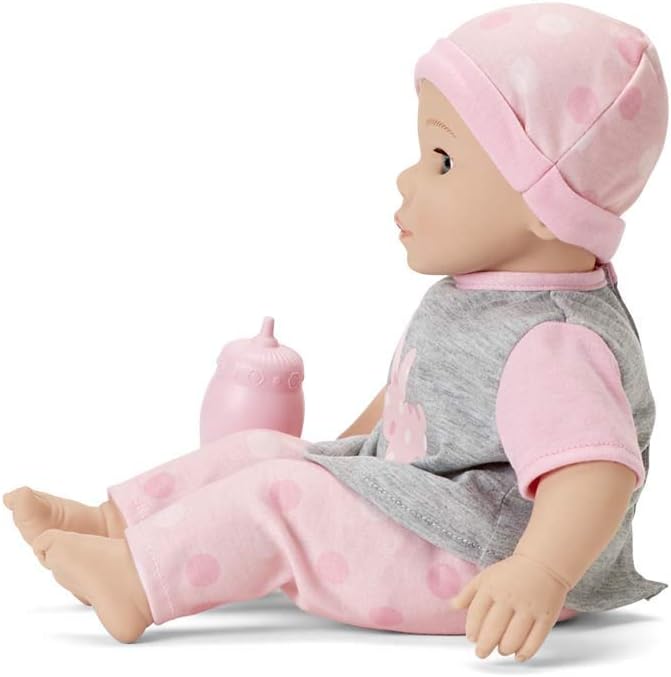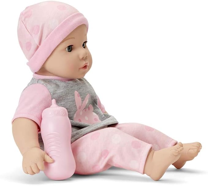 - Details: Dressed in an adorable bunny tee, polka dot leggings and matching cap; Features light skin and blue eyes and includes bottle; Shipped in a window box; Doll wipes clean with damp cloth