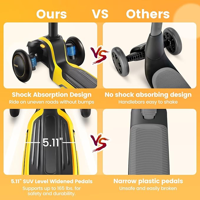 - 【3-Wheeled Lean-To-Steer Design】 3 wheel scooter for kids ages 3-5 are great for young children still learning their balance. The Lean-To-Steer design helps to develop children's balance and coordination. 50mm widened front wheel with shock absorption design makes the scooter ride smoothly and more stable on uneven roads.