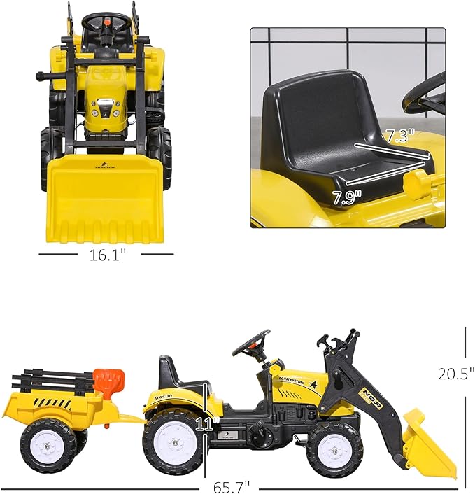 Aosom Kids Ride-On Excavator, Pedal Car Bulldozer, Move Forward/Back with Real Working Dirt Bucket, 6 Wheels, & Cargo Trailer