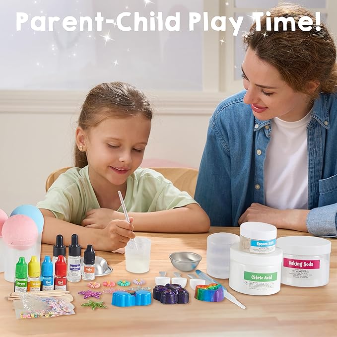 - COMPLETE KIT & SUPER VALUE PACK. This kit includes everything you need for DIY bath bombs and soap. It includes citric acid, sodium bicarbonate, epsom salt, liquid colorings, fragrances, baby oil, soap wax blocks, glitter, surprise charms. It comes with multiple tools, including 12 single-sided soap molds, 2 bath bomb ball mold, 3 teaspoons, 4 beakers, 10 pop sticks, pipette, wooden spa spoon, gift bag, instruction. This kit creates real science fun for kids.