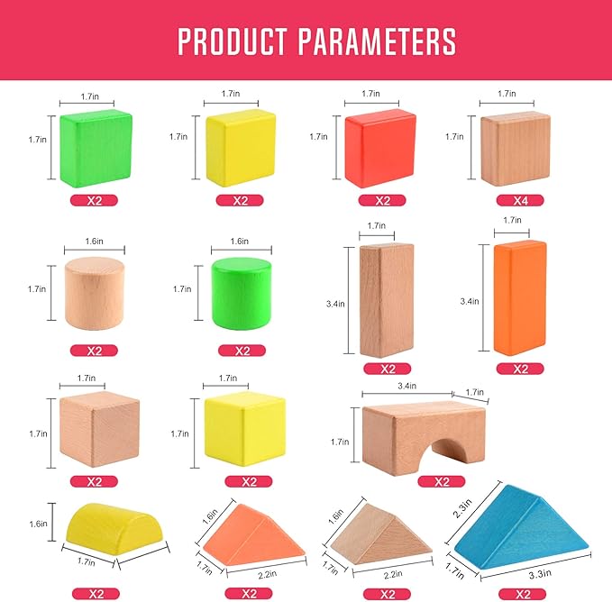 - MOM'S PRIORITY CHOOSE : Contain 32 pieces Big wooden building stacking blocks set, 1 carry bag, package with box. Hardwood high quality and Non-toxic material, Wooden building blocks for toddler have always be an indispensable toy in the growth.They inspire toddler to design, invent, and create.This set comes with 32 blocks in 7 different colors and 8 shapes.