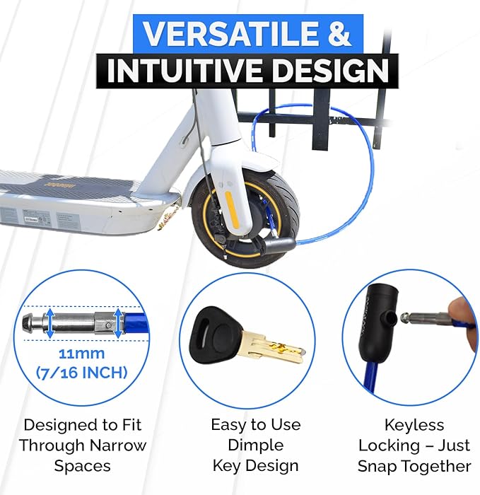 - Versatile and intuitive design. Unlike most security cables, the male end of the cable is the same diameter as the cable itself allowing the cable to pass through narrow spaces such as scooter wheels, kayak and paddleboard scupper holes. Cable is multiuse, multipurpose and can secure a wide range of items such as kayaks, paddleboards, bike, scooters, sport and yard equipment and more.