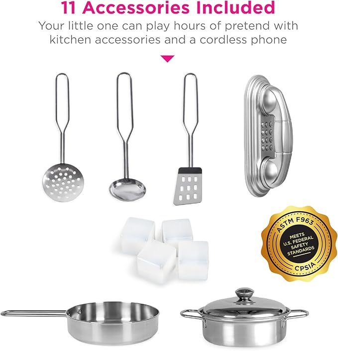 - 11 ACCESSORIES INCLUDED: Set includes 3 utensils, 2 pots, 1 lid and kitchen comes with an ice maker that dispenses 4 ice cubes, and cordless phone; keep the accessories in the overhead shelf, the oven, in the fridge, freezer, microwave, or dishwasher