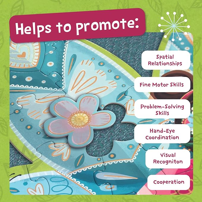 - UNIQUE DESIGN: This magical fairy floor puzzle is made of thick, sturdy pieces with shiny foil and glitter accents. Puzzle pieces are uniquely shaped for curious minds and include a ladybug, heart and other glittery shapes.