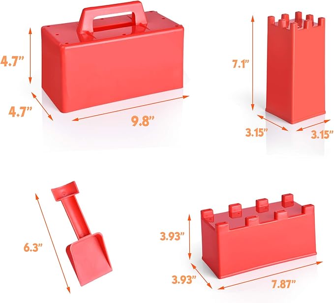 - SAND SANDBOX TOYS KIT: Including a large sand castle mold kit (9.84’’x4.72’’x6.69’’), 2 different wall molds to make tall and long castle parapets, and a shovel (6.38’’x2.56’’). 4 Pieces Snow Fort Building Block. Sand Sandbox Toys for Toddlers 1-3