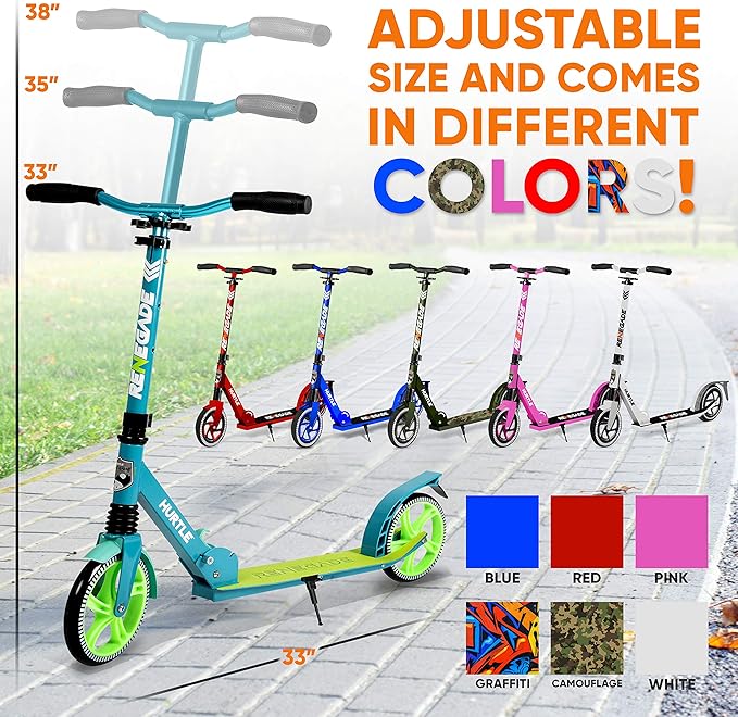 Hurtle Renegade Kick Scooter for Kids, Teenagers & Adults - 2-Wheel Folding Scooter with Adjustable T-Bar Handlebar - Alloy Anti-Slip Deck