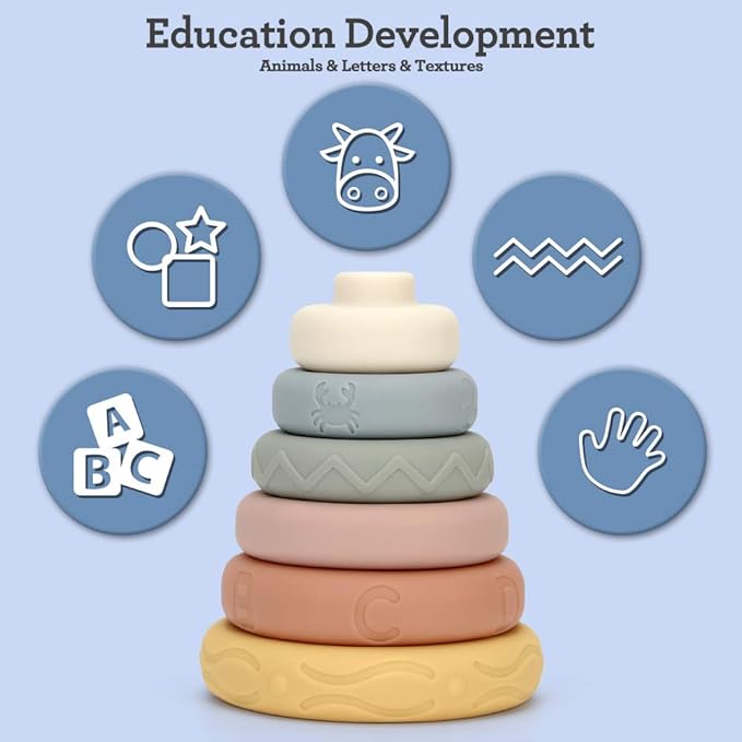- STEM Early Development - Our ring stacker is a thoughtful baby sensory toys for babies. Include animals, shapes, letters and textures for baby early knowledge learning. It’s not only exercise children’s hand-on ability and creativity. Also develop kid’s color perception, digital cognition and shape recognition while they playing stacking game.