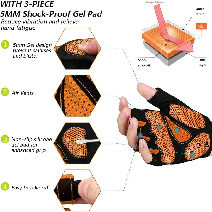 - 【Full Palm Protection & 5MM Palm Pads】:With extra thicken 5mm Gel pad at palm part,non-slip silicone surface material,relieve pain and fatigue with super shock absorption effect.They can reduce the numbness and reduce road vibration,hand fatigue,skip-proof and hard wearing,avoid stuffiness of palm even in vigorous exercise.Bid your farewell to the calluses and blisters.