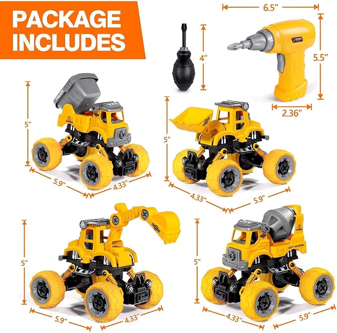 - SUPER VALUE TAKE APART TOYS SET: 4-in-1 construction toys for boys, build as Excavator, Bulldozer, Cement Mixer and Dump Truck at one time. Made of premium non-toxic ABS plastic, polished smooth edges, not hurt your littles. Excellent toy trucks meet US toy standard of CPSIA and ASTM, super safe truck toys for 3 4 5 6 7 8 year old boys girls!