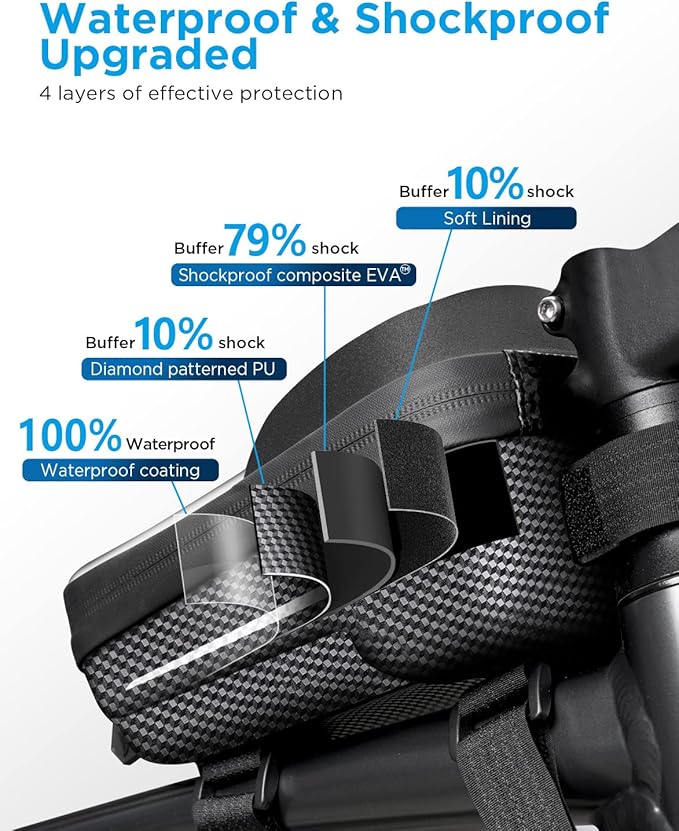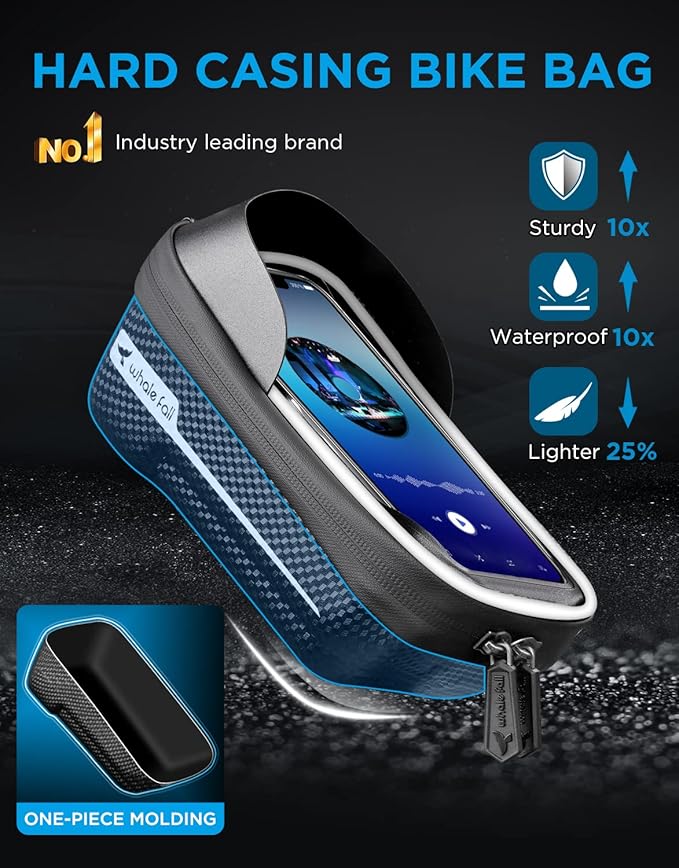 - Latest Bike Phone Bag: All-in-one design with 3D die-casting process make Whale Fall EVA frame bag hard, pressure-resistant and waterproof. Not easy to deform, and it still maintains the original shape after years of use. The built-in mesh bag allows your items to be placed in the bag orderly