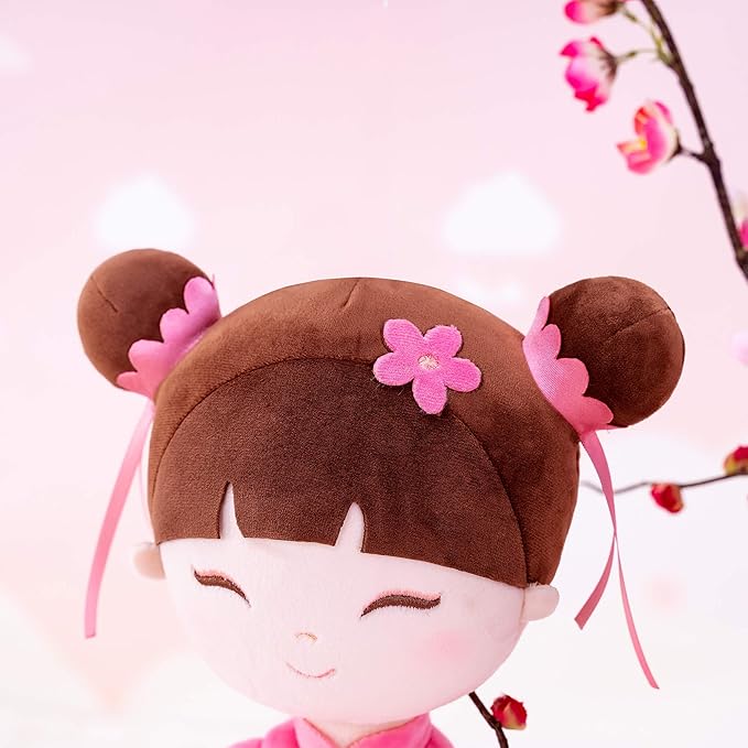- 🌸 Charming Hair Accessories: Featuring two adorable hair buns, decorated with pink flower hairpins and flowing ribbons, the doll’s hairstyle adds a playful and delicate flair that children will love.