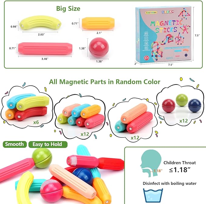 - 【Starter STEM Toy for Cognitive Growth】: The 42pcs magnetic building set introduces toddlers to STEM concepts in a fun, accessible way. It fosters early cognitive development, color recognition, shape understanding, and fine motor skills through hands-on play. Designed for safe and easy handling, the set allows children to experiment with simple 2D and 3D structures, encouraging logical thinking and creativity.