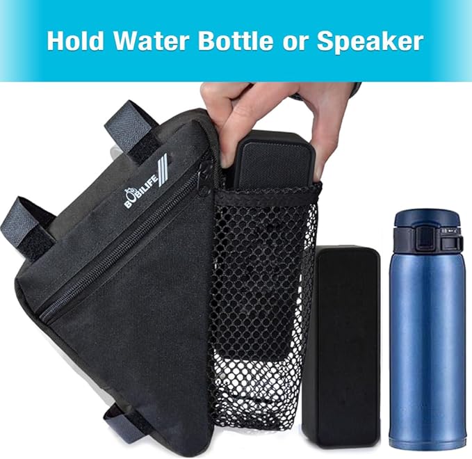 - UPGRADE WITH BOTTLE HOLDER - We upgrade the bicycle triangle frame bag with a water bottle holder, it supports most of the water bottles. And we can also put other things inside this holder like mini speakers, bike tools etc.