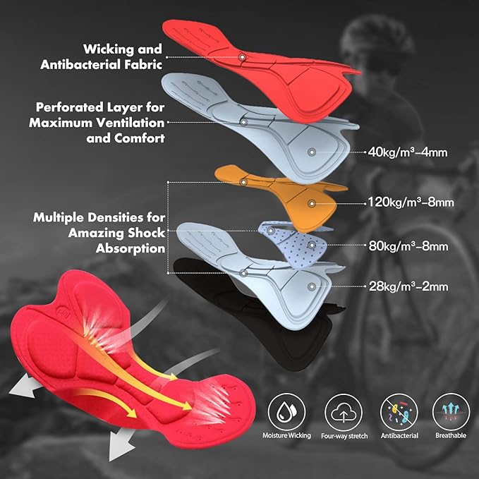 - 4D PROTECTION PAD: 6 layers of high impact foam offer comfort and high protection from injuries during long-distance cycling. A highly engineered design includes a four-way stretch and laser-cut rounded edges for a smooth and chafe-free feel. The surface of the pad is ultra-perforated, making it lightweight, breathable, and help to prevent saddle sores.