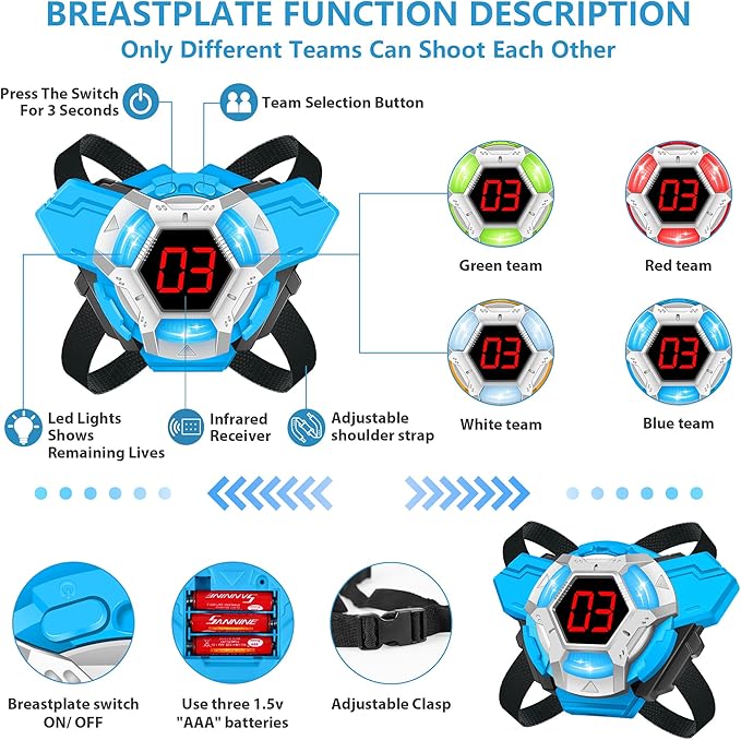 - Easy to set up:Open the battery case and insert batteries by the correct oplarity,laser tag uses 4 AAA batteries and Breastplate uses 3 AAA batteries(not included batteries).Build your team,then switch modes and you can experience an exciting combat game in your house,yard or other outdoor area.