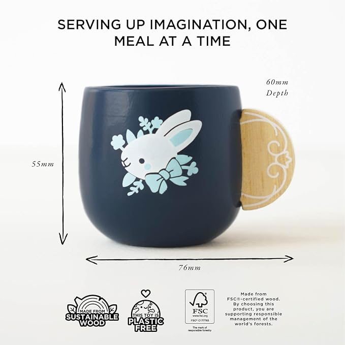 - PLAY FOOD: This kitchen utensils set is decorated with 2 contrasting tones of blues, white and exposed wood. Made from sustainable wood and part of our plastic free collection, these kids toys are great for imaginative play and social interactive skills