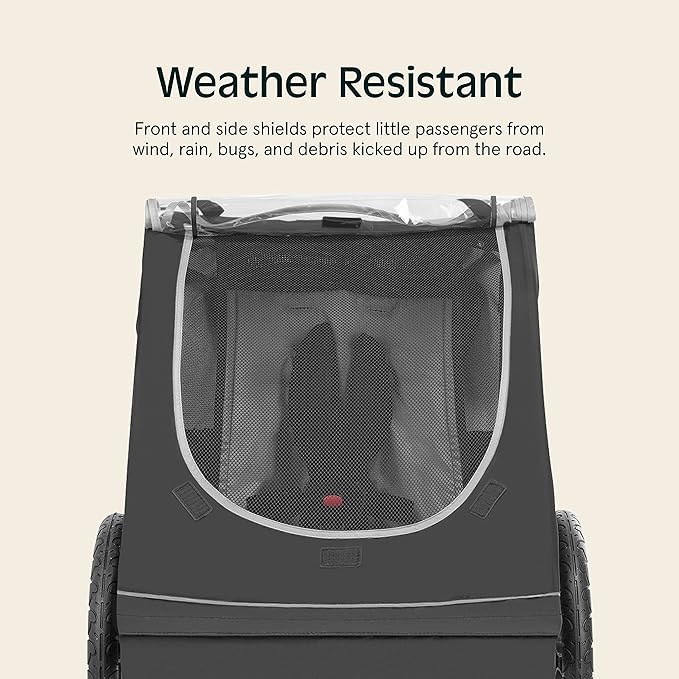 - WEATHER-READY PROTECTION: Durable shields and vented windows guard your bike trailer for kids passengers against rain, wind, bugs, and road debris while maintaining comfortable airflow throughout