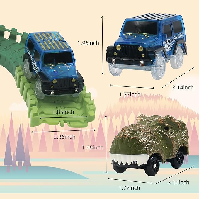 - Build Dino Track, Stay Away From Screens - The race car and dinosaur car require 1 piece of AA battery/each (NOT INCLUDED). They run on the track well with flash light make the game more interesting more attractive. Meanwhile, develop children's fine motor skills and eye-hand coordination, cultivate children's creativity and imagination.