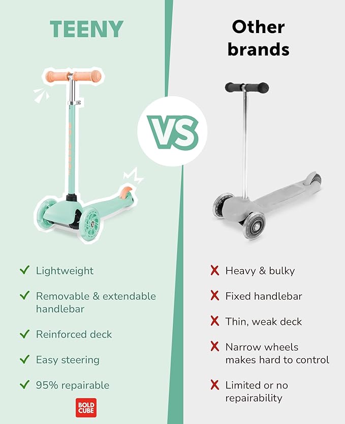 - BOLDCUBE’s Teeny three wheel Scooter is the perfect entry level toddler scooter for girls & boys age 3 - 6 years old. Engineered with a Lean to Steer / Tilt to Turn steering system and completely self balancing, it’s the ideal first scooter for toddlers developing balance and confidence to take the pavements!