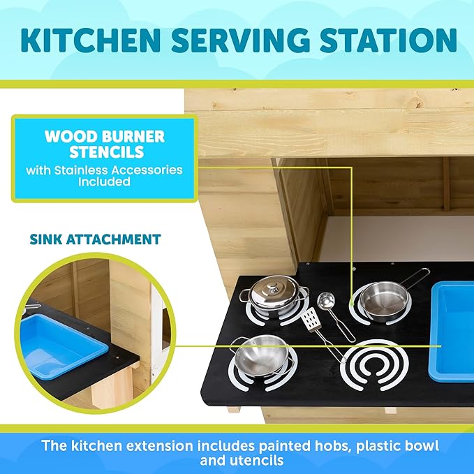 Outdoor Kids Kitchen Playset Wooden Playhouse for Kids - Toddler Pretend Play Kitchen, Accessories, Sturdy, Weatherproof, Door, Windows, Sink, Wood Burner Stencils, Easy Assembly, Ages 3+