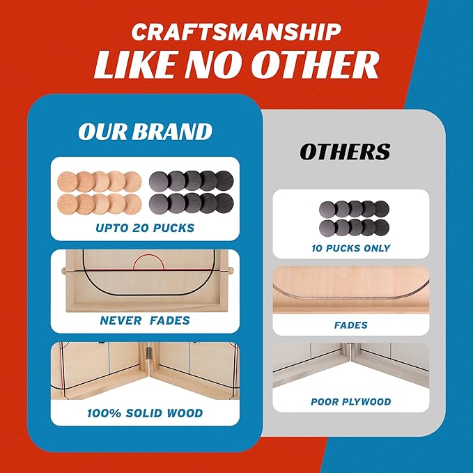 - FAST PACED WOOD BOARD GAME FUN: Experience the thrill of rapid-fire action as you sling pucks across the board to outscore your opponent! So Puck It and play indoor or outdoor on any table top.