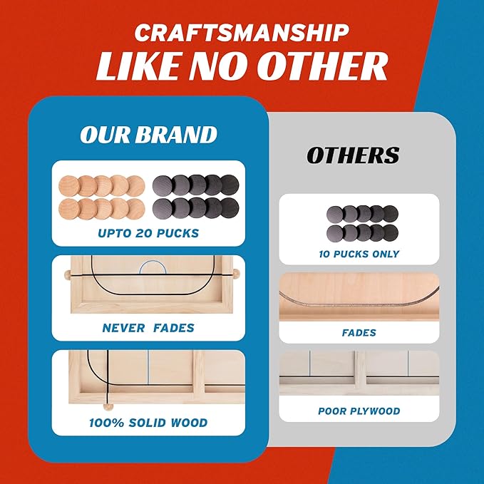 - FAST PACED WOODEN BOARD GAME FUN: Experience the thrill of rapid-fire action as you sling pucks across the board to outscore your opponent! So Puck It and play indoor or outdoor on any table top.