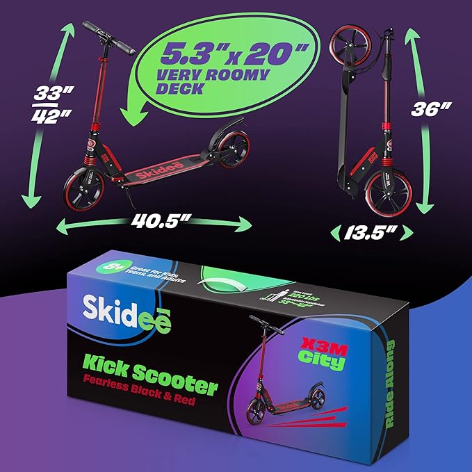 - A SCOOTER FOR EVERY AGE AND STAGE: Skidee kick scooters grow with you, from kids learning to ride to adults commuting. The adjustable handlebar (31.5"-41", 4 height levels) fits all ages, while the 220 lb weight capacity ensures durability for smooth, everyday rides.
