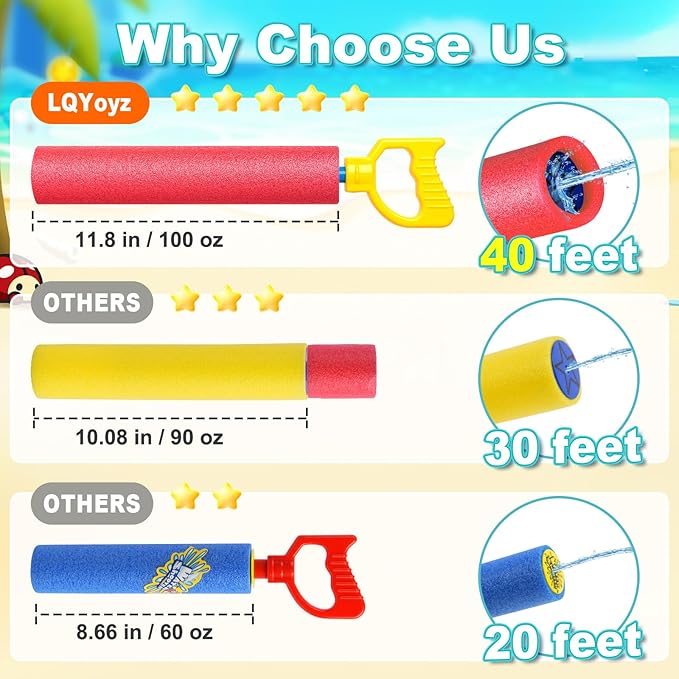 - ๐๐ฎ๐ฆ๐ฆ๐๐ซ ๐๐๐ญ๐๐ซ ๐๐ฎ๐ง ๐๐จ๐ฒ: Spray water to 40 feet with our 6 packs of colored long range LQYoyz water guns! These water guns are very light and float on the water, so they won't sink when you put them in a swimming pool. Suitable for children aged 3-12, it is the best way to keep cool in hot summer