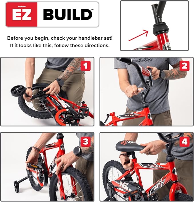 - EZ BUILD ASSEMBLY: With Huffy’s exclusive EZ Build system, setup is fast and frustration-free—just insert the handlebar, fold the pedals down until they click, and you're ready to ride!