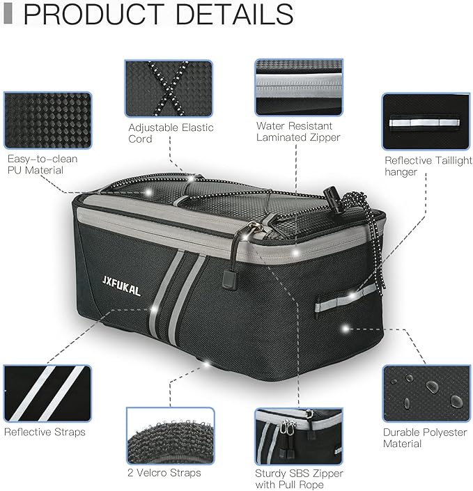 - WATER RESISTANT & STURDY: The bicycle rack bag is made of PU leather & polyester, which is durable, water repellent and easy to clean. It even comes with rain cover that completely helps protect the trunk and the stuffs in it from dirt, sand, water, rain and snow.