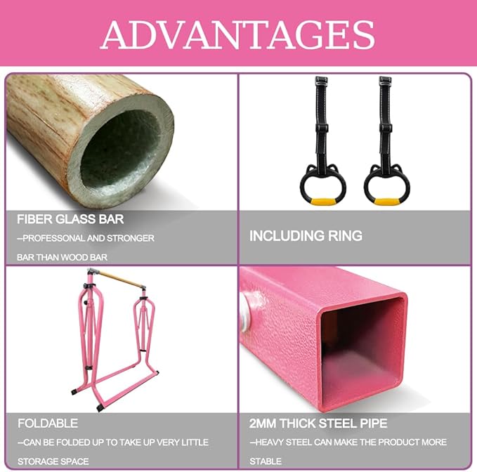 - ★Adjustable Height★:The gymnastics bar can be easily adjusted up or down in height, From 3ft to 5ft with 13 LEVELS, it Is perfect for young gymnasts and users of any age and height as it can be adjusted to Their height as they grow.Being able to exercise or improve ability at their convenience of their home at anytime.