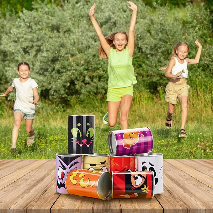 - Super Value. Our indoor and outdoor Halloween game set comes in 13 pcs. It includes 10 pcs of Metal Tin Cans and 3 pcs of Beanbags. Each bean bag toss measures 2.9X 4.7 ines while the can measures 2.6 X4 ines.