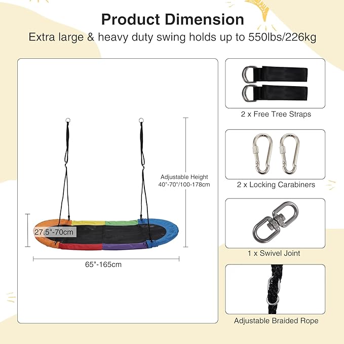 RedSwing 65" Saucer Swing for Kids, Giant Platform Swing for Outdoor Playground, Flying Oval Surf Swing Strong Heavy Duty, 500lbs Weight Capacity, Easy to Asssemble, Rainbow