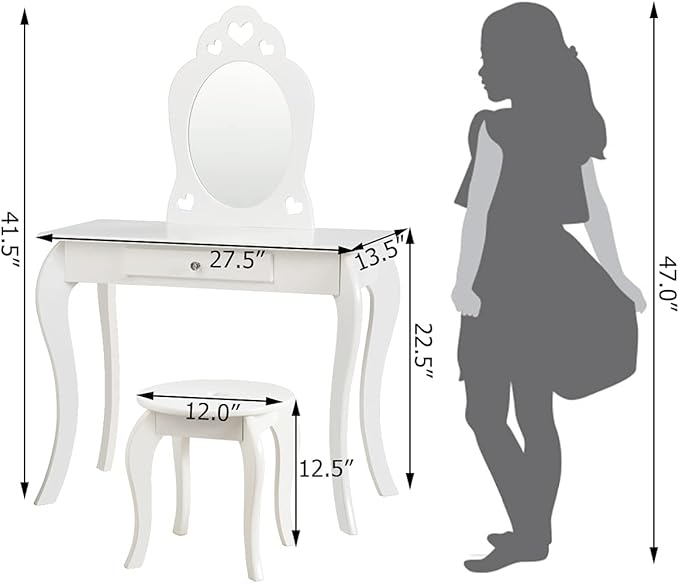- 【Detailed Specification & Easy Assembly】 Table Size:27.5"x13.5"x41.5" (L x W x H); Stool Size:12" x 12" x 12.5" (L x W x H) . Height of Tabletop: 22.5”. Detailed instruction and complete accessories are included in the package for easy and quick installation. If you have any assembly question, please feel free to ask customer service staff for help. ️Note: the kids vanity set can’t be sold separately and don’t come with lights.