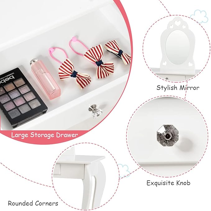 - 【Perfect Gift for Little Girls】Our girls vanity set with mirror and stool is a wonderful addition to your little princess bedroom, which absolutely adds a touch of elegance. This kids vanity is the ideal birthday gift, Christmas gift, or just as a surprise. Your little princess is bound to be attracted by this stylish look and unique design.