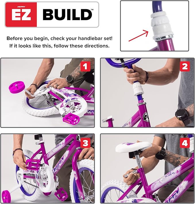 - EZ BUILD ASSEMBLY: Huffy’s exclusive EZ Build system makes setup quick and stress-free—just insert the handlebar, fold down the pedals until they click, and you’re ready to ride.
