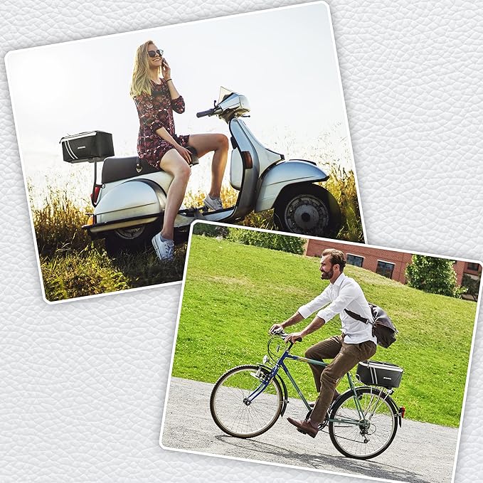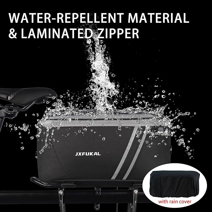 - WATER RESISTANT & STURDY: The bicycle rack bag is made of PU leather & polyester, which is durable, water repellent and easy to clean. It even comes with rain cover that completely helps protect the trunk and the stuffs in it from dirt, sand, water, rain and snow.