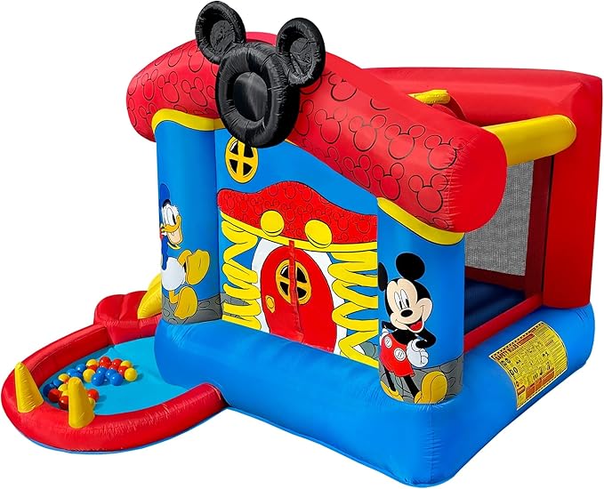 - COUNTLESS BOUNCE HOUSE FEATURES - This Fun Bounce House has a Bouncing Area, Climb and Slide, Basketball Hoop, Ball Pit and Ring Toss Game for Hours of Excitement for Kids. With tons of Safety Features and High Quality Production, the Mickey Mouse Funhouse is sure to bring the bounce to your house.