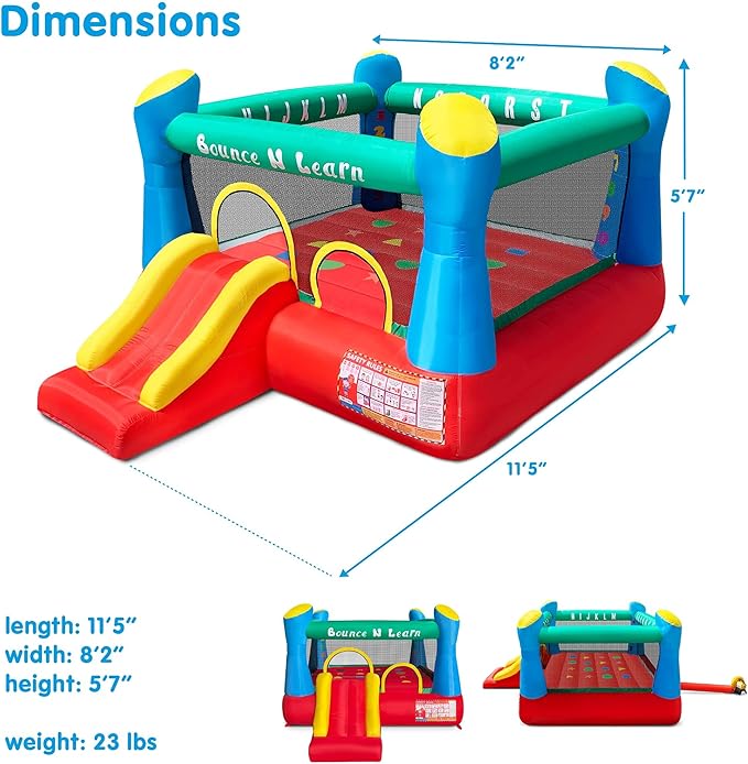 - EDUCATIONAL JUMP AND SLIDE - This playhouse features educational elements like the full Alphabet from A to Z, Numbers 1 to 10, and even Colors and Shapes on the bounce house jumping area. Your kids will love all the elements in this toddler bounce house as they jump and learn all day long.