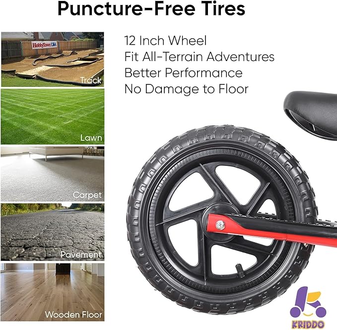 - EXTRA-THICK ALL-TERRAIN TIRES – We want kids to feel strong and stable when they’re moving on grass and sidewalks which is why we added puncture-resistant tires to the front and back of each balance bike for 5-year old’s and 24-month-old riders.