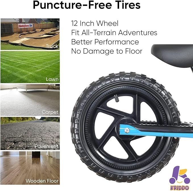 - EXTRA-THICK ALL-TERRAIN TIRES – We want kids to feel strong and stable when they’re moving on grass and sidewalks which is why we added puncture-resistant tires to the front and back of each balance bike for 5-year old’s and 24-month-old riders.