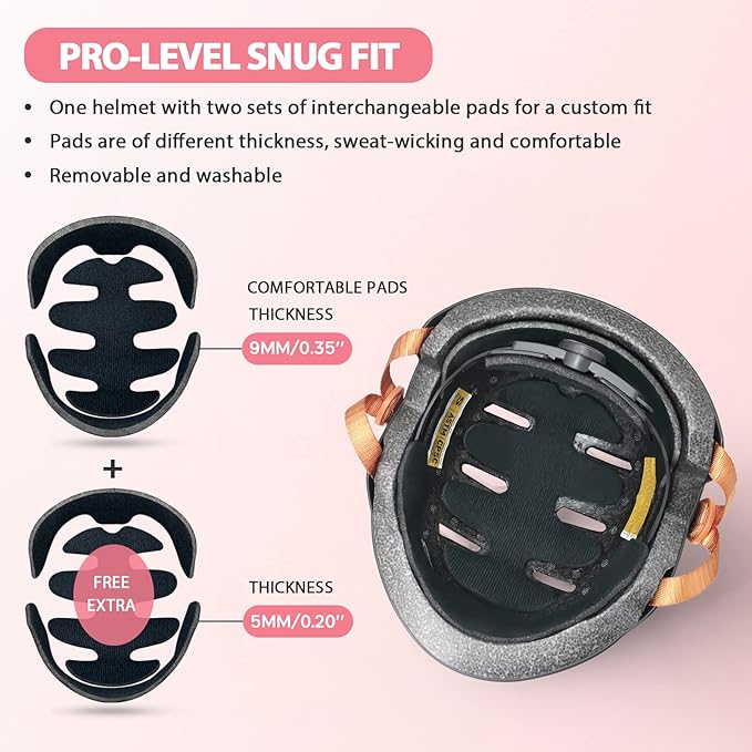 - 【PERFECT FIT & ADJUSTMENT】 Two sets of removable, moisture-wicking pads in two different thicknesses. Use them individually or combine them to customize a cozy fit. The back of the helmet equips with built-in dial fit system, making the helmet fit your head exactly