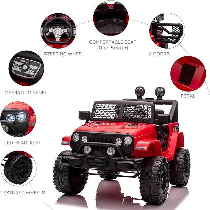 - Safety Is A Top Priority: Just like on a real truck, this kids motorized vehicles with remote control prioritizes safety. Each wheel has a shock absorber for off-road fun, and the spring system ensures a smooth ride for driving on both the asphalt and dirt.