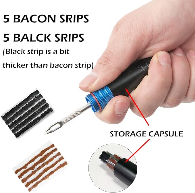 - 5 Bacon and 5 Black Strips are included in this plug kit, black strip is a bit thicker than bacon strip, if you get a hole that black strip still not enough, you could twist a few strips strands together and repair like normal.