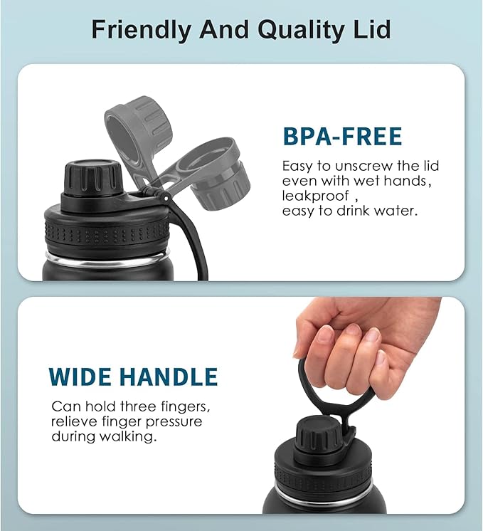 - 【Wide Handle & Leak-Proof Lid】Three-finger wide handle can balance the gravity of the water bottle during walking, and you will not feel pain in your fingers. Plus, our excellent lids are 100% leak-proof. Whether you're camping, hiking, kayaking or rock climbing, KOODEE is designed to provide you with the best water solution!